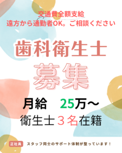 歯科医師2名 歯科衛生士3名、歯科助手4名 合計9名 歯科衛生士としてスキルUPをしたい。